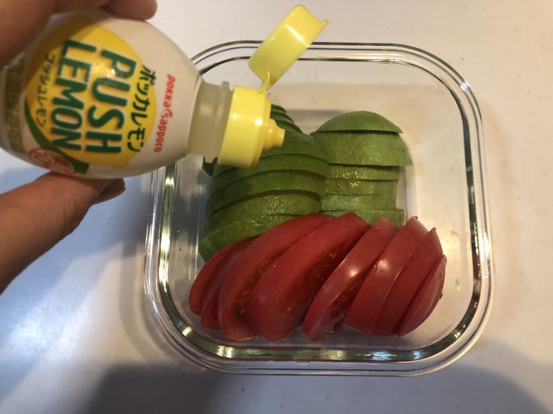 ②アボガド・トマトを切る。アボガドは変色防止のため(あれば)レモン汁をかけておく。
