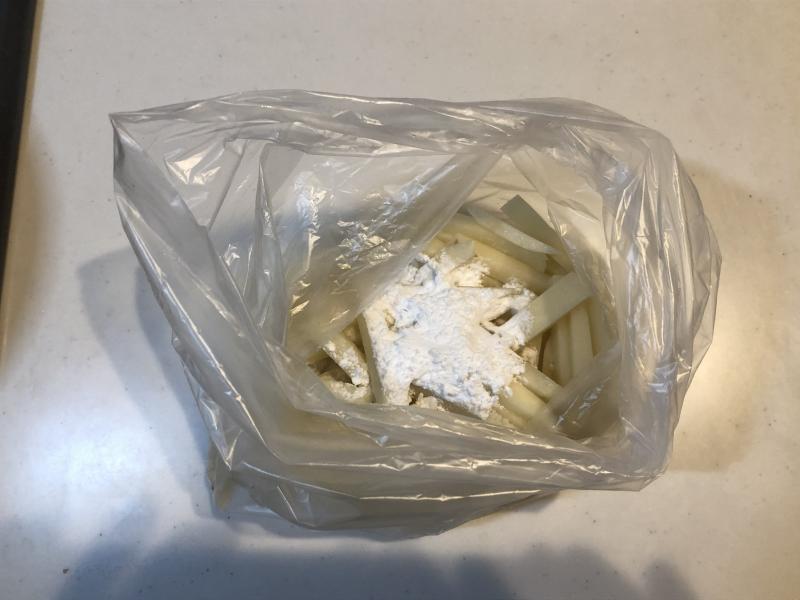 ②ポリ袋に水気を切ったポテトと片栗粉を入れ、フリフリする。