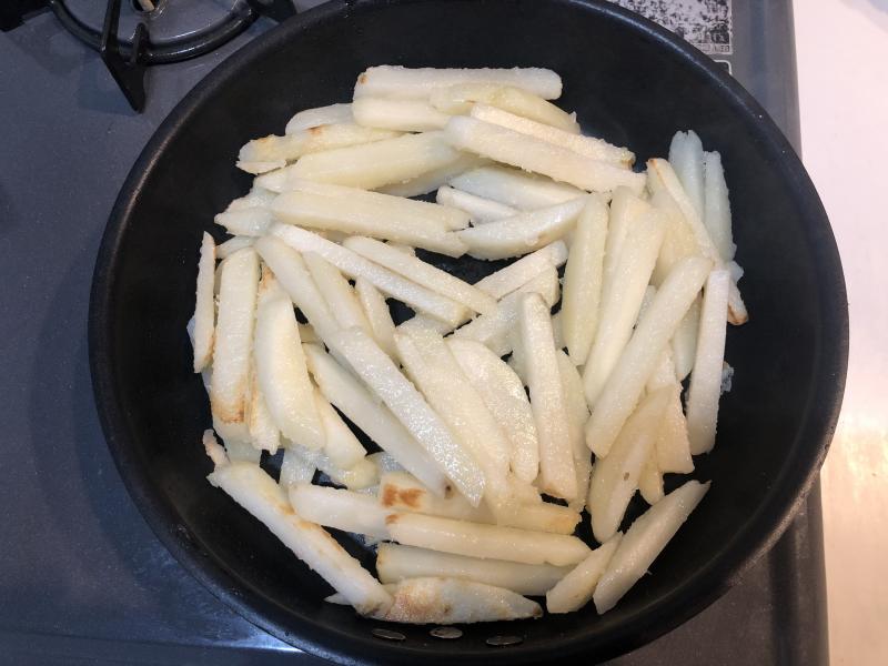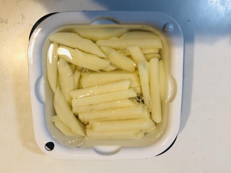 ①じゃがいもを拍子切りにし、水で10分ほどさらす。