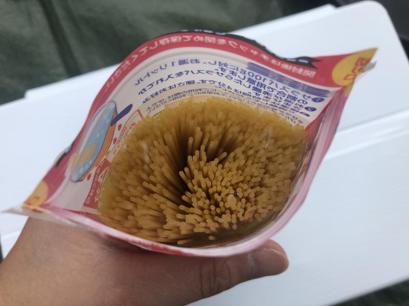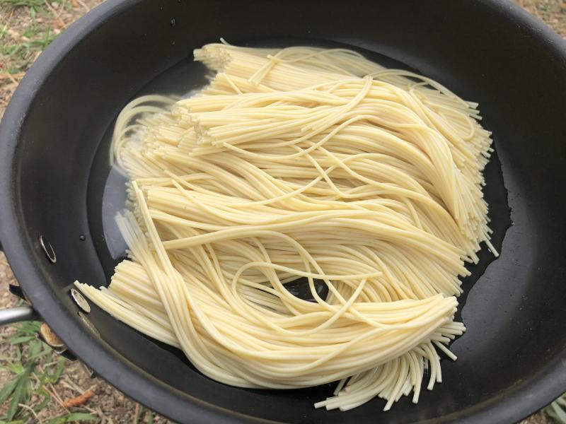 →先に水を含ませることで茹で時間の短縮、生パスタのような食感、茹で汁なしで調理が可能です。