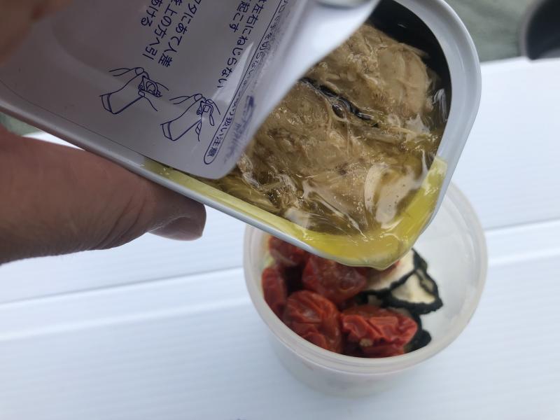 ②干し野菜に缶詰の中のオイルをひたします。オイルがない場合はオリーブオイルを入れておきます。