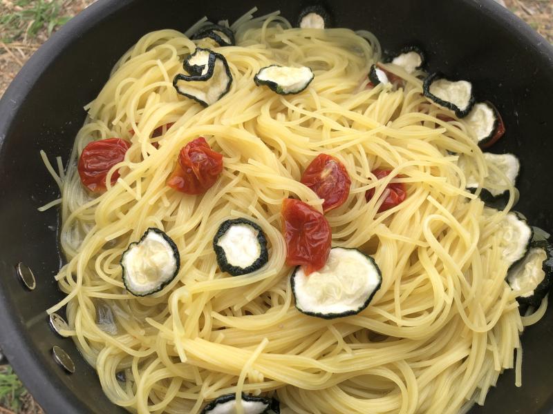 ③吸水して白くなったパスタ①とオリーブオイルで戻した干し野菜を加えます。