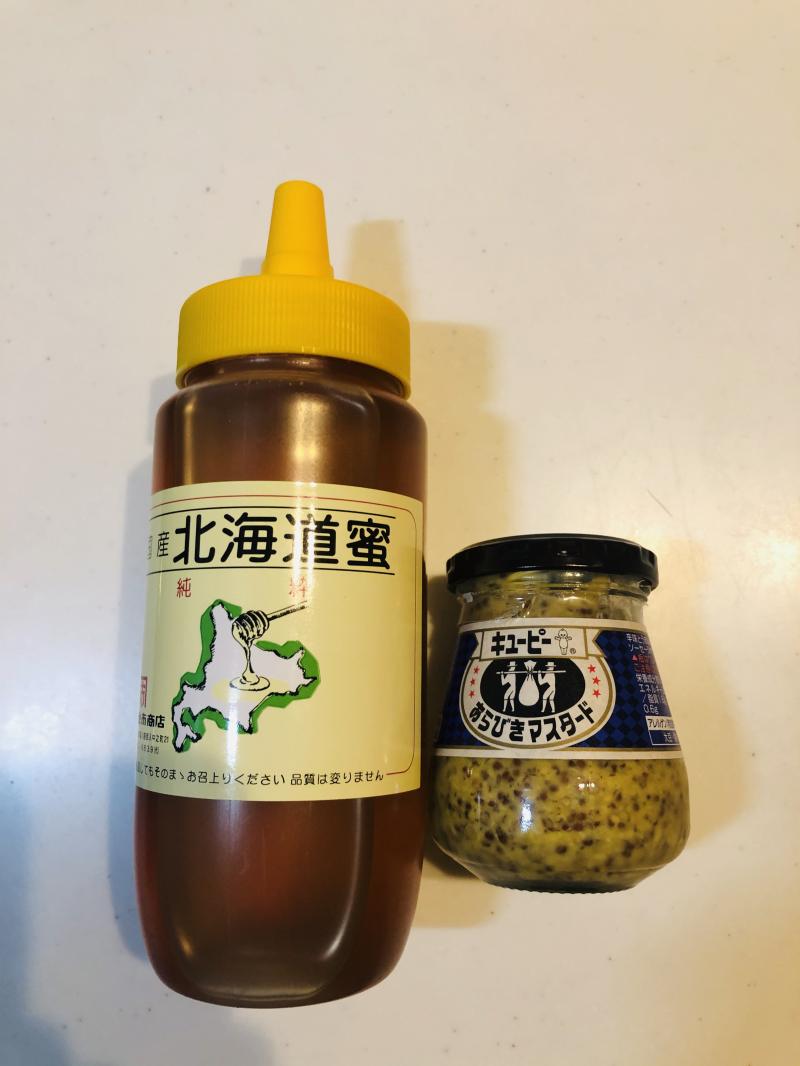 ③粒入りマスタードとはちみつを1:1で混ぜる。なくても大丈夫です。