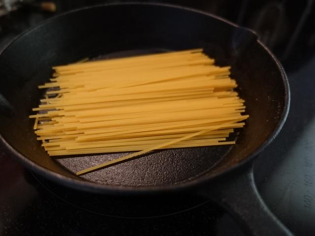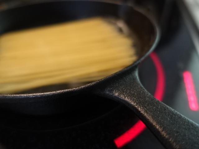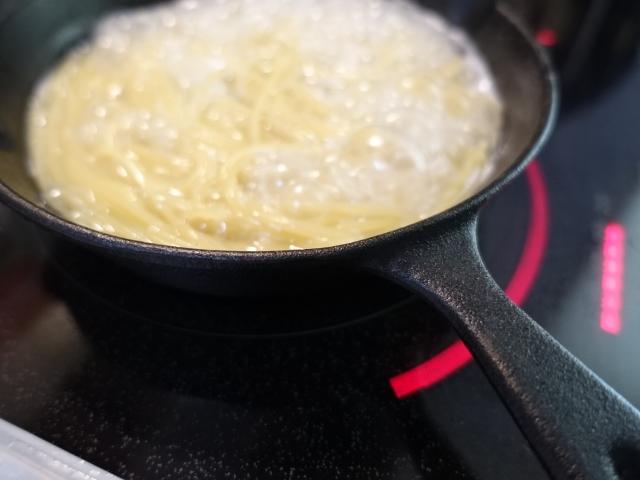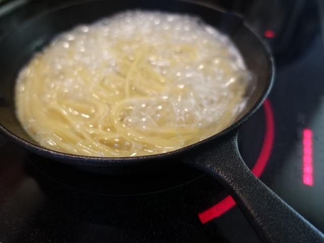 パスタ(太さ1.6mm 7分茹で)水300ml 塩小さじ1杯程度 オリーブオイル小さじ1杯 黒コショウ少々 レトルトのパスタソース スキレット