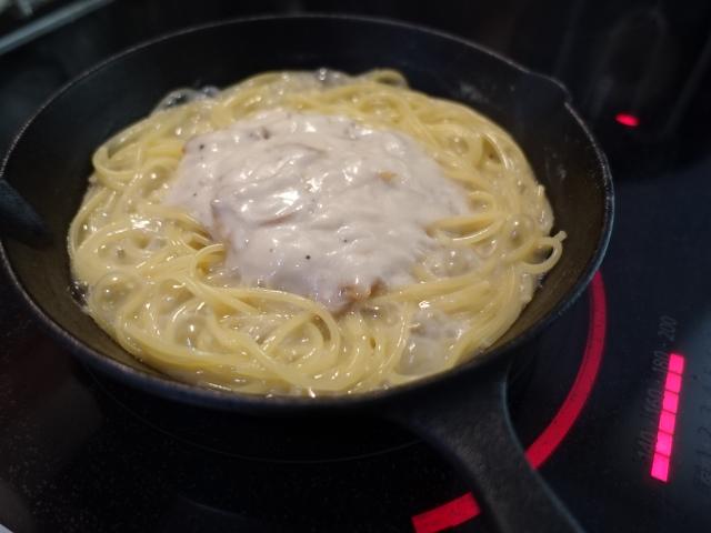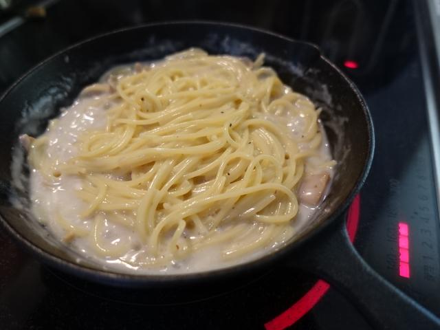 6)ソースが温まり全体に絡んだら黒コショウを振ってスキレットのまま食卓へ