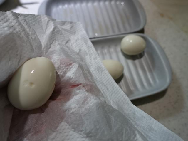 1)ゆで卵は2晩冷蔵庫で白だしに漬け込んで「味付けたまご」にしてあります