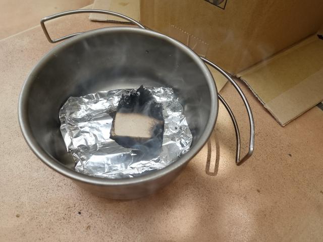 4)スモークウッド表面に着火 煙が出ている事を確認して自作燻製器の中にセット