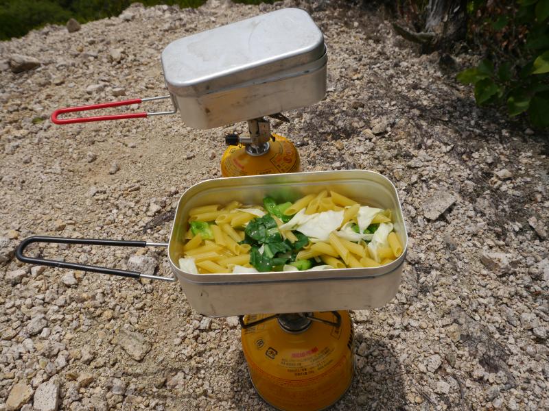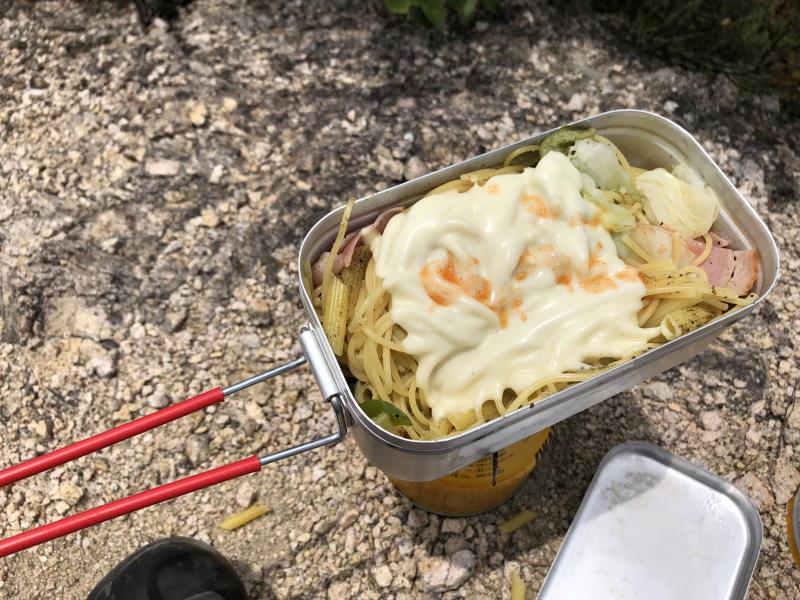 ハイキング再開の乾杯をして、ありあわせの具材で簡単パスタ。ご近所ハイキングならではの時間をゆっくり使った大休憩でした。