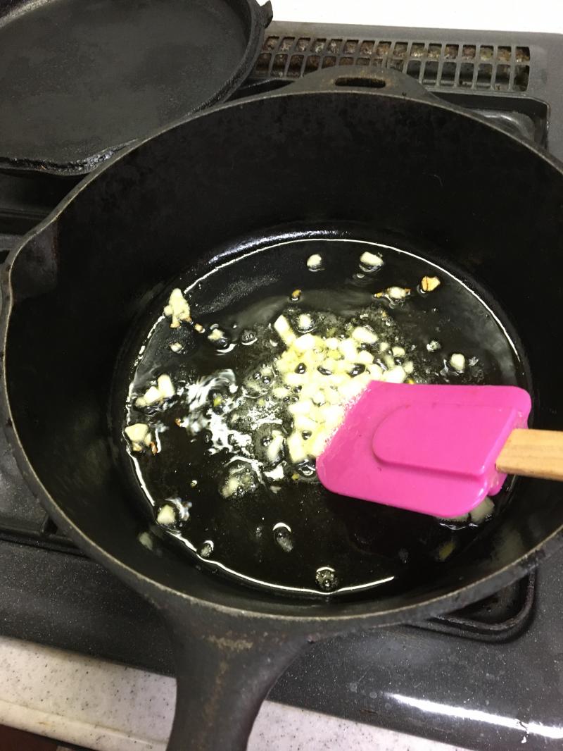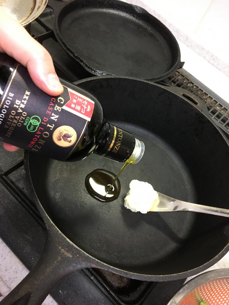 ①ダッチオーブンを熱して油とギー(なければ油だけでもOK)を入れにんにくを弱火で炒める。