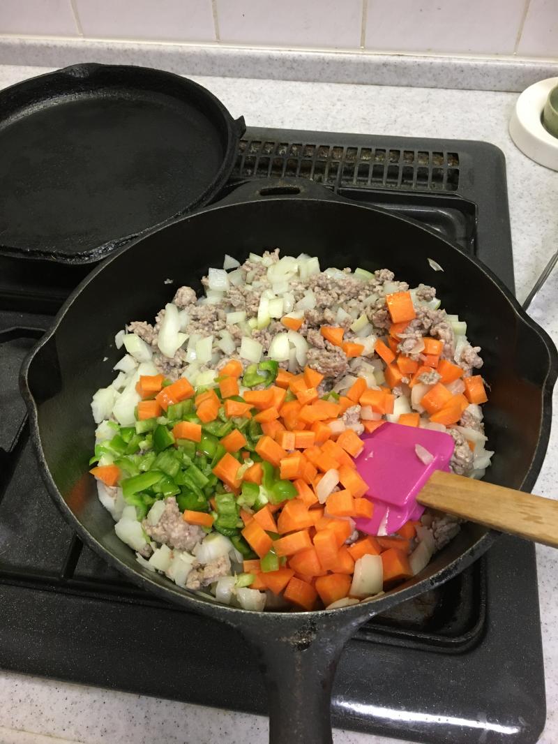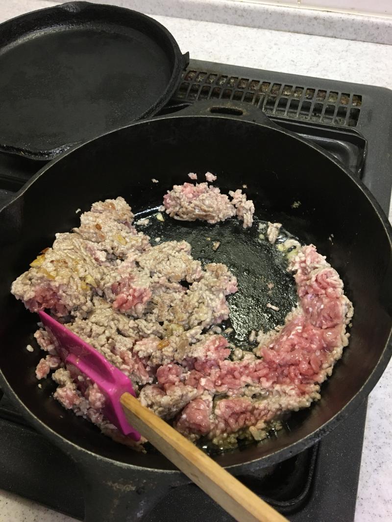 ②香りが出てきたらひき肉を中火で炒め、火が通ったら野菜を入れて炒める。