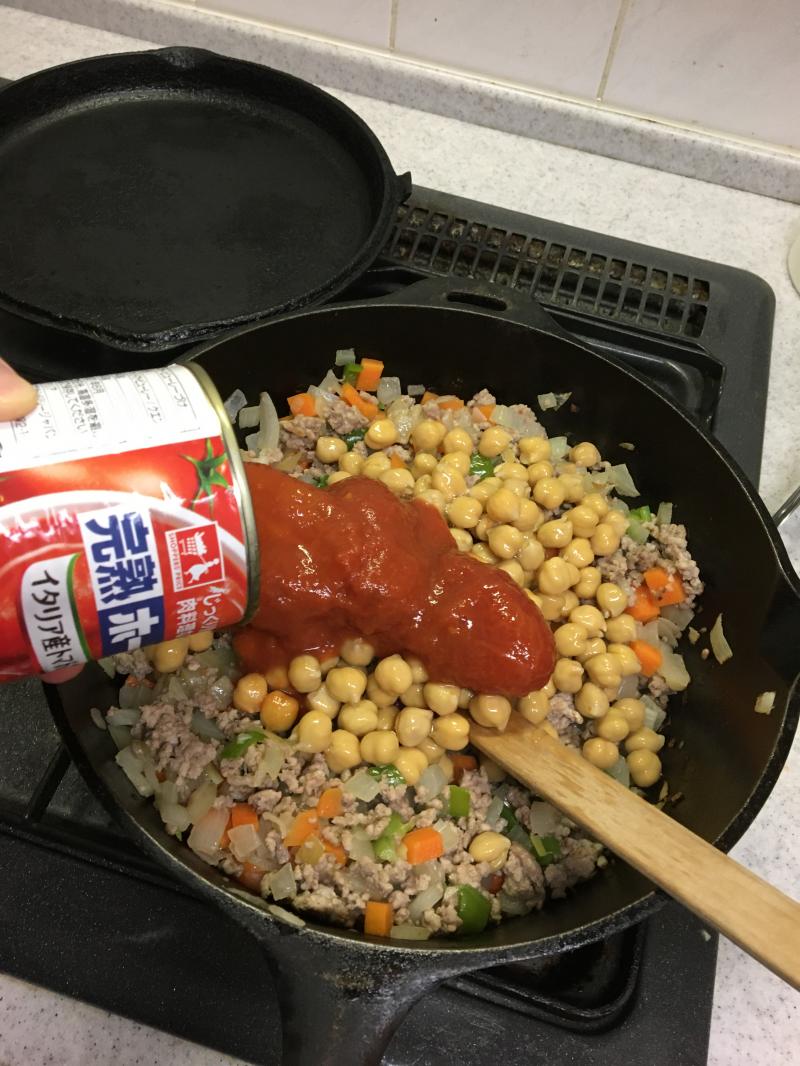 ③野菜に火が通ったらひよこ豆とホールトマトを入れて炒める。