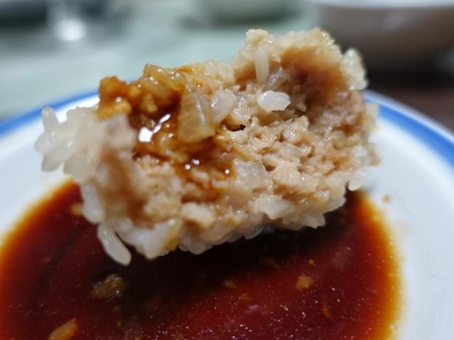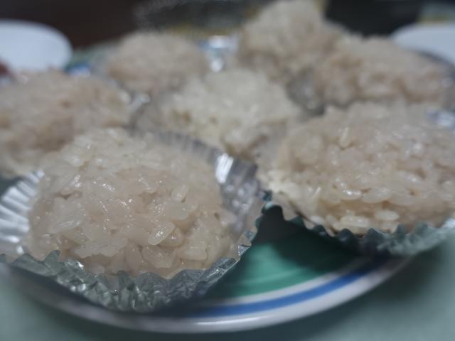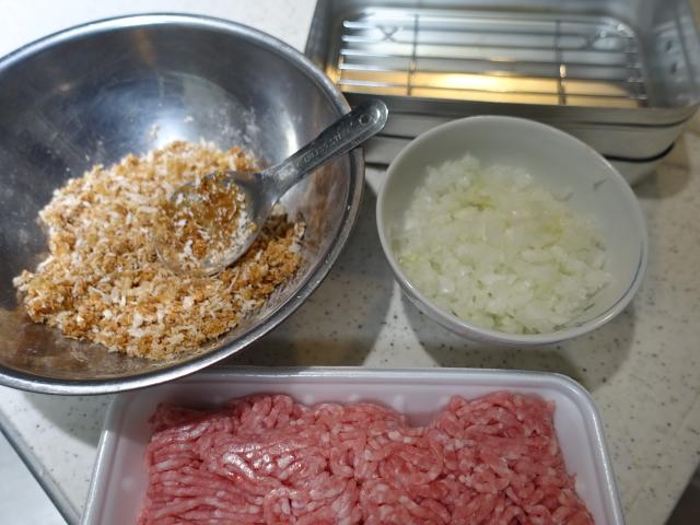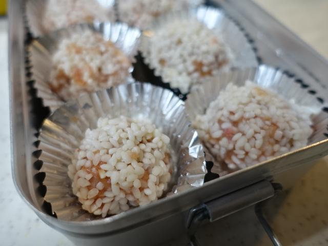 もち米1カップ 豚ひき肉300g 玉ねぎ1/2個(100g) たまご1個 パン粉1/2カップ 片栗粉大さじ2杯 砂糖おおさじ1杯 醤油大さじ1杯 塩大さじ2/3 中華味の素少々 チューブしょうが少々 オイスターソース少々 メスティン(大) プリムスP-153バーナー