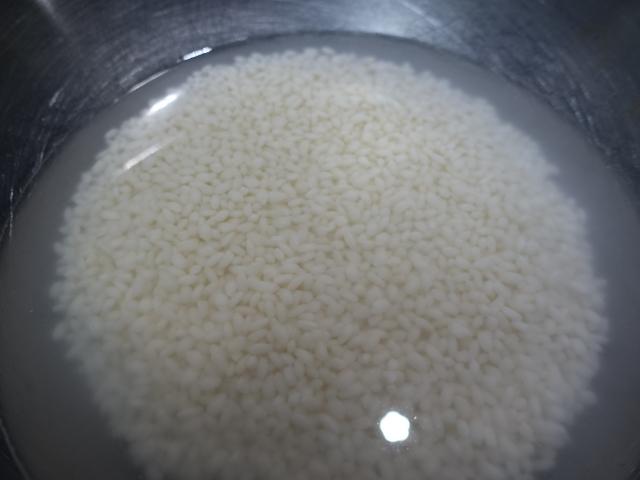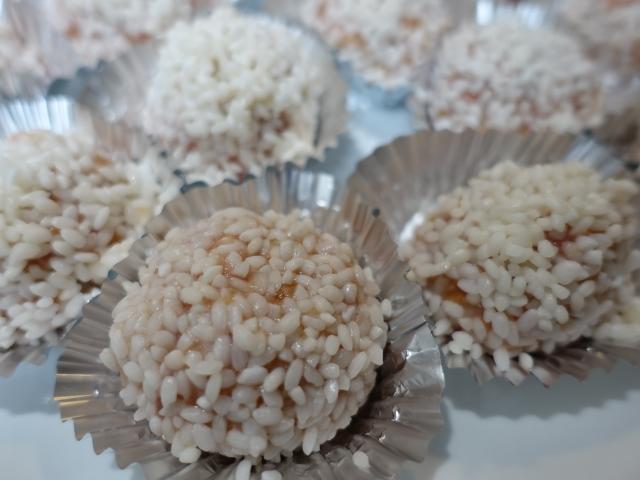 5)2cm位を目安にだんごにしてもち米の上で転がしアルミケースに載せる