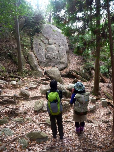 - 駐車場(0:30)落ヶ滝(1:00)天狗岩(1:10)狛坂磨崖仏(0:50)