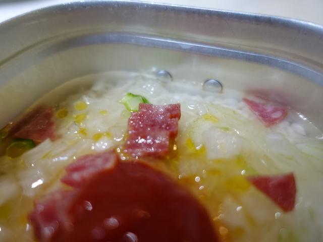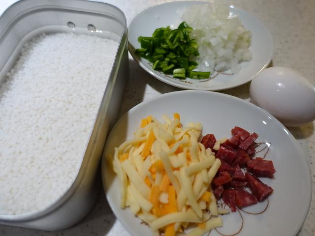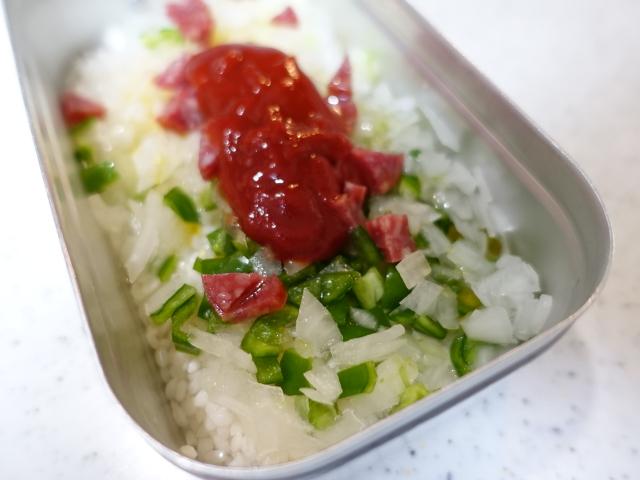 お米1合 玉ねぎ1/4カット ピーマン1/2カット サラミスライス4枚 チーズ大さじ1杯 たまご1個 ケチャップ大さじ1杯 オリーブオイル大さじ1杯 コンソメ小さじ1杯