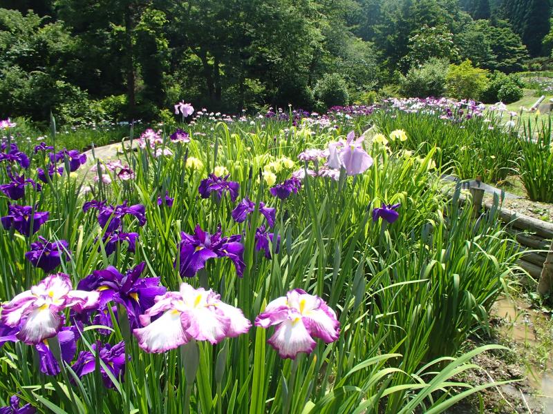 ・立派な薬師堂の門を抜け、両神神社の中を通り抜けると菖蒲園があります。見ごろを迎えた色とりどりの菖蒲が咲き誇っています。ちょっとしたサプライズでした。下調べしてなくて良かった!