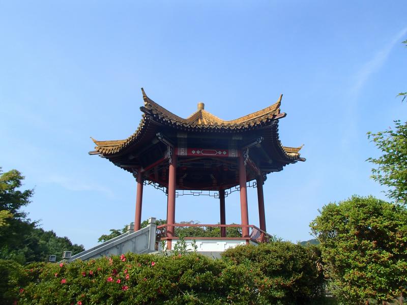 ・登山口の先は「観景亭」と呼ばれる中国風の東屋へと続く道の途中に当たります。せっかくなので観景亭に立ち寄り、展望を楽しみます。正面に並ぶ山並みと眼下の街並みがなかなかいい感じです。