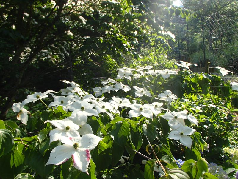 ・下っていくとこれまた中国風の門があり、ここが鳥居山コースの基点になっています。目の前が菖蒲園。行きしなには気付かなかったのですが、菖蒲以外にも山法師や紫陽花の花がきれいに咲き誇っていました。10分ほどうろうろしながら写真を撮って道の駅へ。いやぁ~、暑かった・・・。