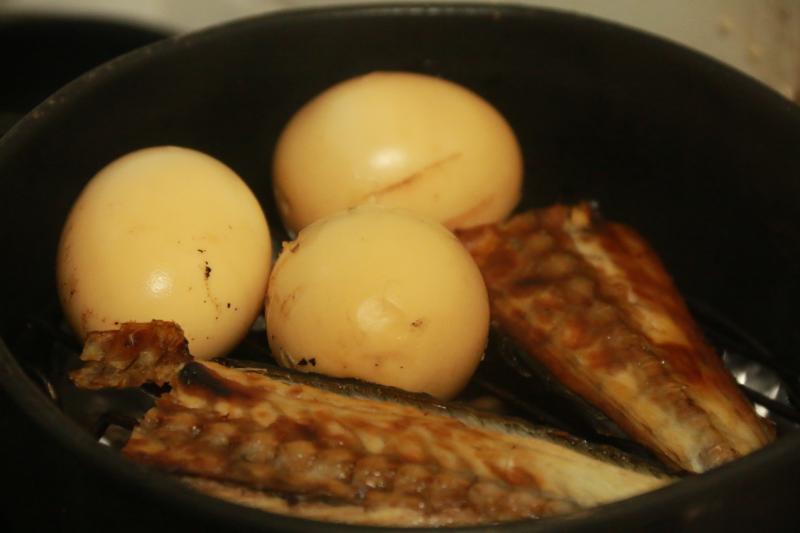 魚と卵、チーズなど あらゆるものを燻製します。今回の燻製チップはヒッコリーです。