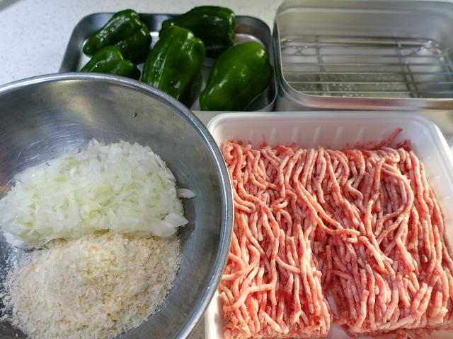 ひき肉300g ピーマン5個 玉ねぎ1/4カットみじん切り パン粉1カップ 塩/胡椒少々