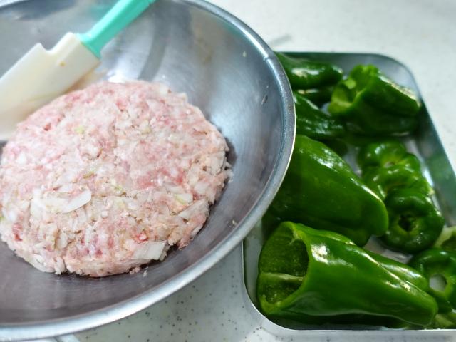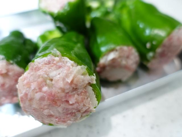 3)ピーマンの中に1)のこねたひき肉を隙間が出来ないようにぎゅうぎゅう詰めていく