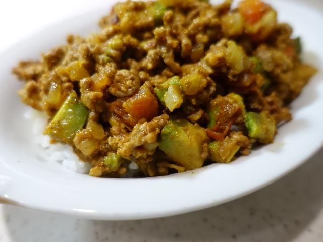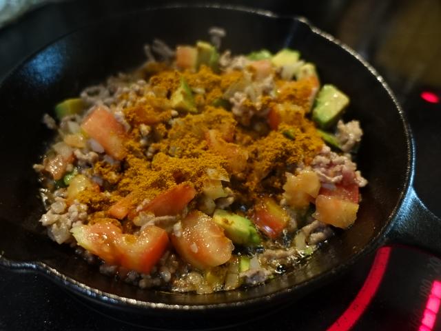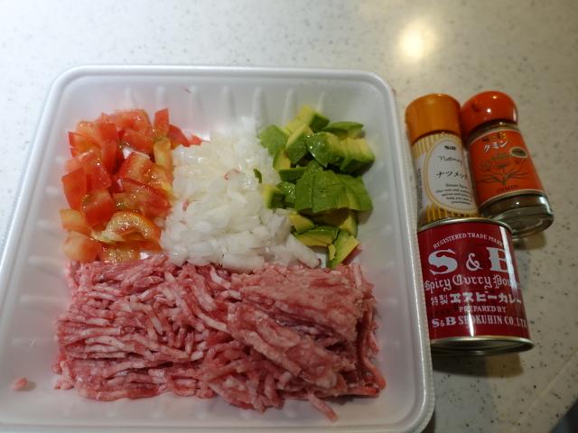 合い挽きひき肉300g アボカド1/2カット 玉ねぎ1/4カット トマト1/2カット カレーパウダー大さじ3杯 クミンパイダー小さじ1杯 ターメリック小さじ1杯 サラダオイル大さじ2杯 塩胡椒少々