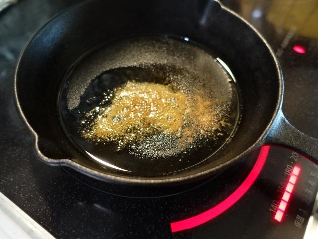 2)スキレットにオイルを注ぎクミン、ターメリックを香りが出るまで温める