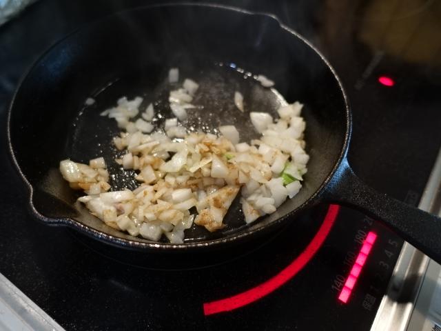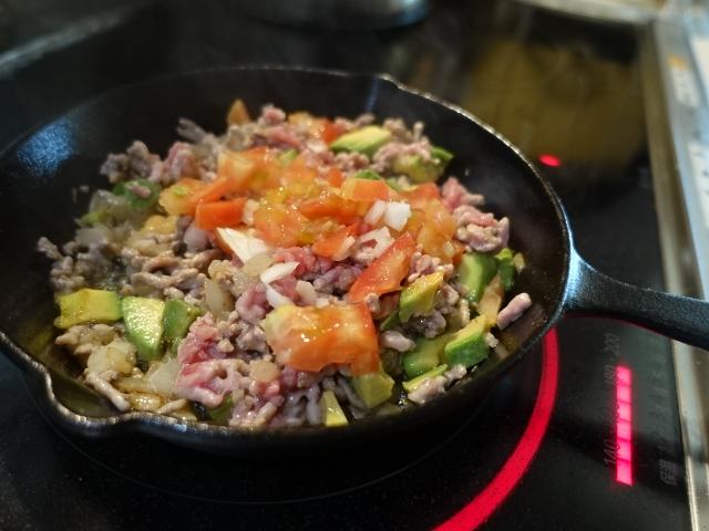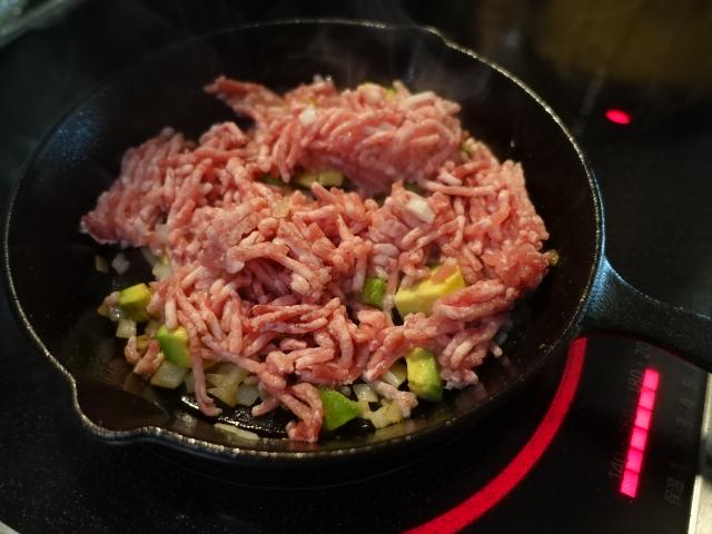 3)2)に玉ねぎ投入 塩胡椒を振り半透明になるくらいまで火を通したらアボカドひき肉の順で入れていく