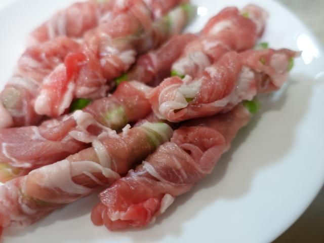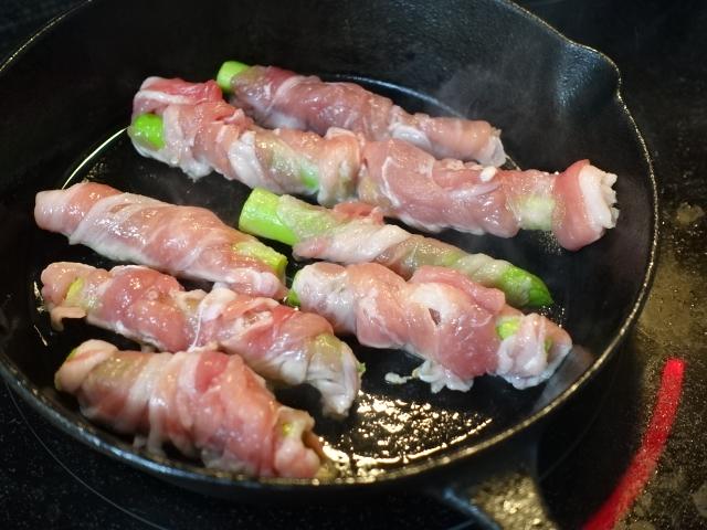 2)豚肉に塩胡椒をふりアスパラに巻き付けていく