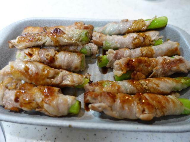 アスパラ4本 豚肉薄切り300g オリーブオイル大さじ1杯 塩黒コショウ少々 醤油/みりん大さじ1杯