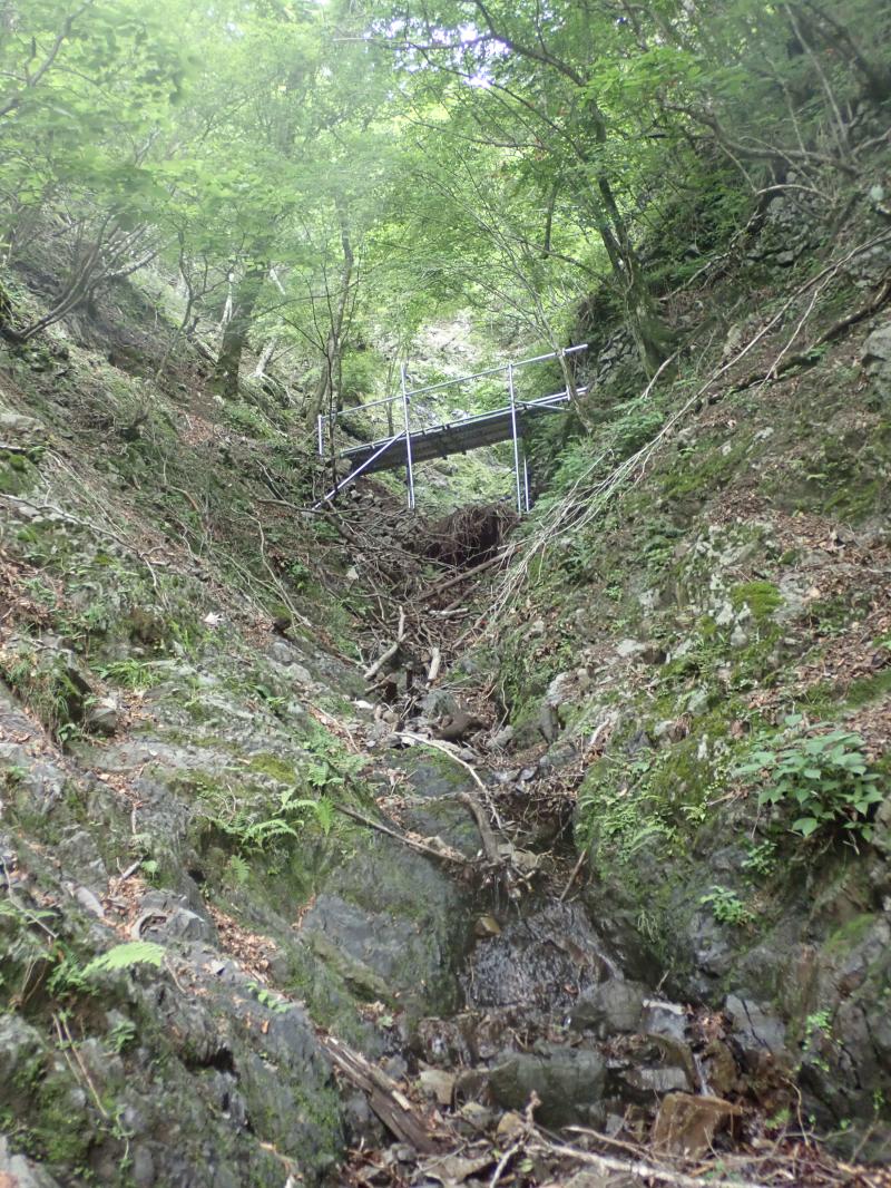 つめもやさしく、ガレをしばらく登って一般登山道の橋の下に出てきます。