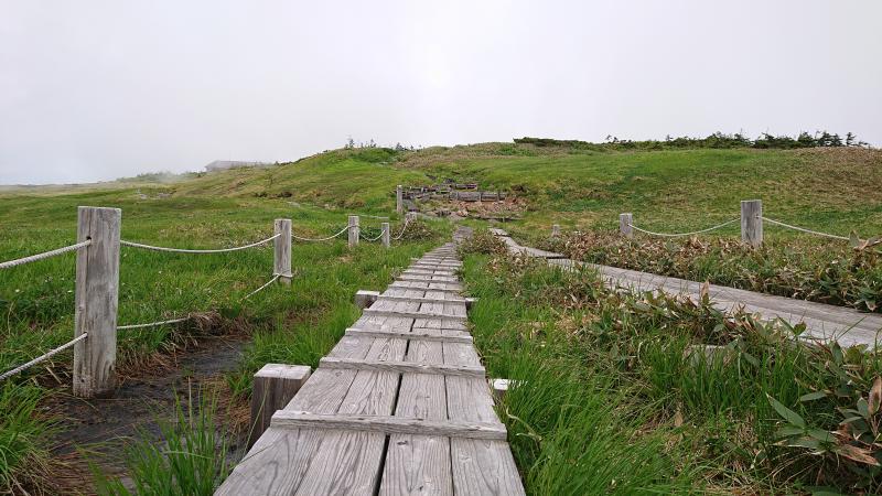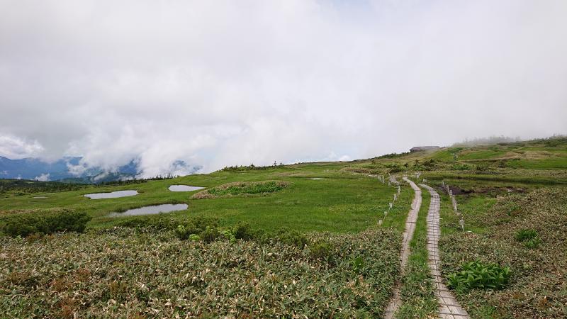 山頂までの登山道はしっかりと整備され、木道もしかれており山頂の池塘にはたlくさんの華が咲いていて
