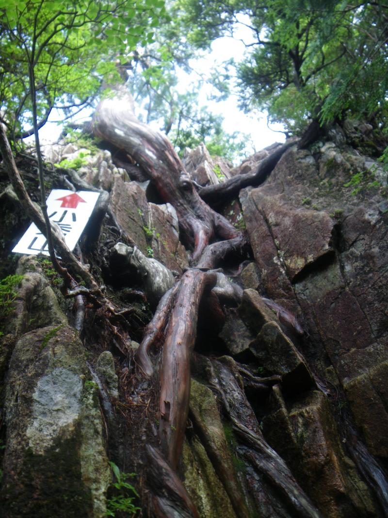 ➄鎧岩は岩場直進コースと断崖横断コースがあるが、横断コースにはロープがあり通行止