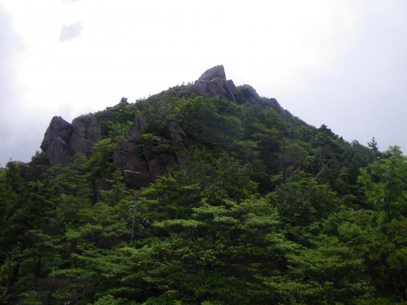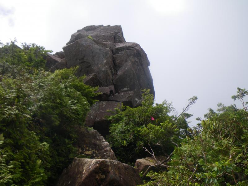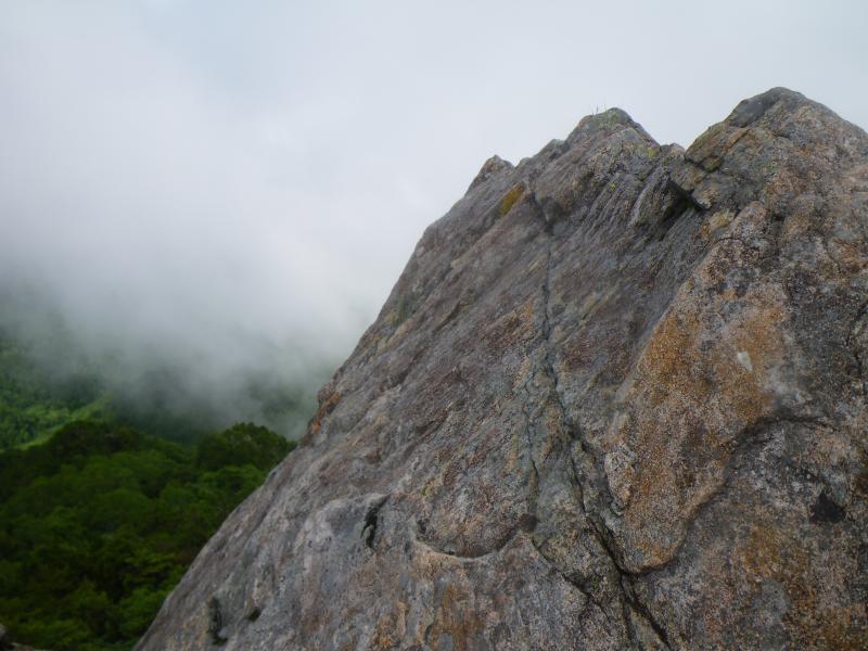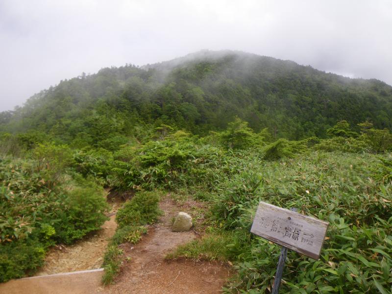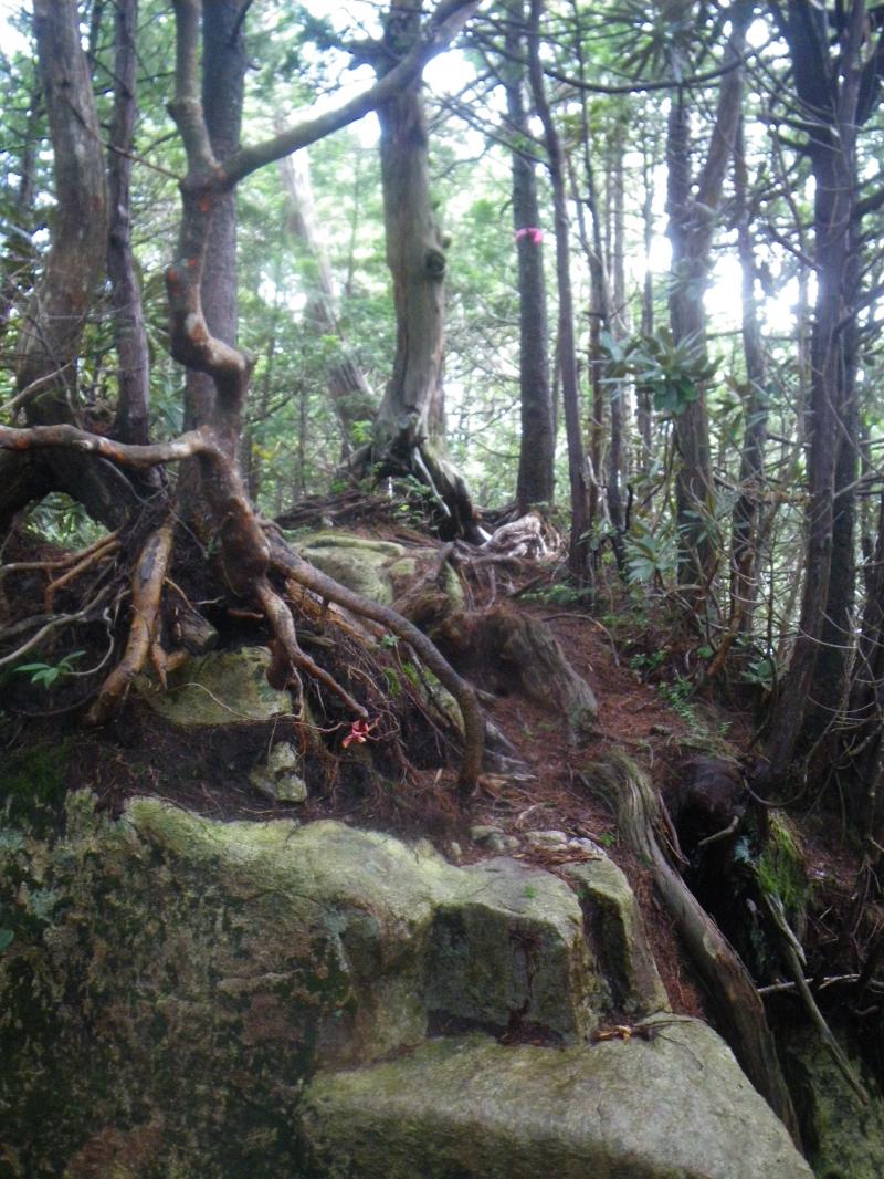 しかし、雨は降らないものの生憎の曇り模様で山々はガスの中。おまけに目的のオオヤマレンゲも見当たらずで、もくもく登るのでした。ここから山頂までがまた長い長い道のりで濡れた笹原と泥付いた登山道で湿りながら1時間はかかりました。