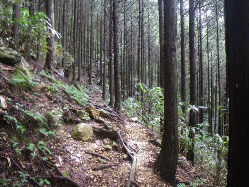 ➂登山口からしばらくで植林帯のグネグネ道を延々と進み、休憩適地➀から上は急な尾根道に変わる