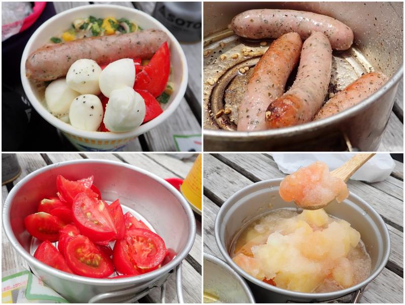 ・カップ麺にソーセージ・モッツアレラチーズ・自家製とまとをON。
