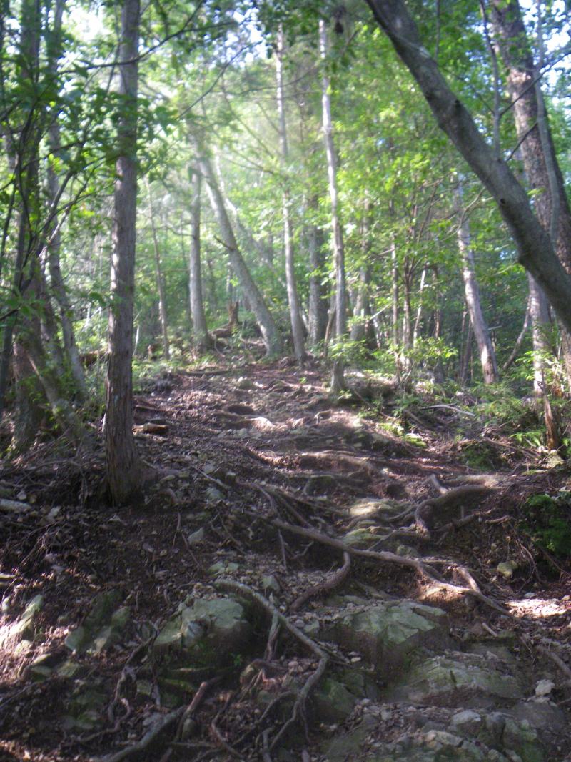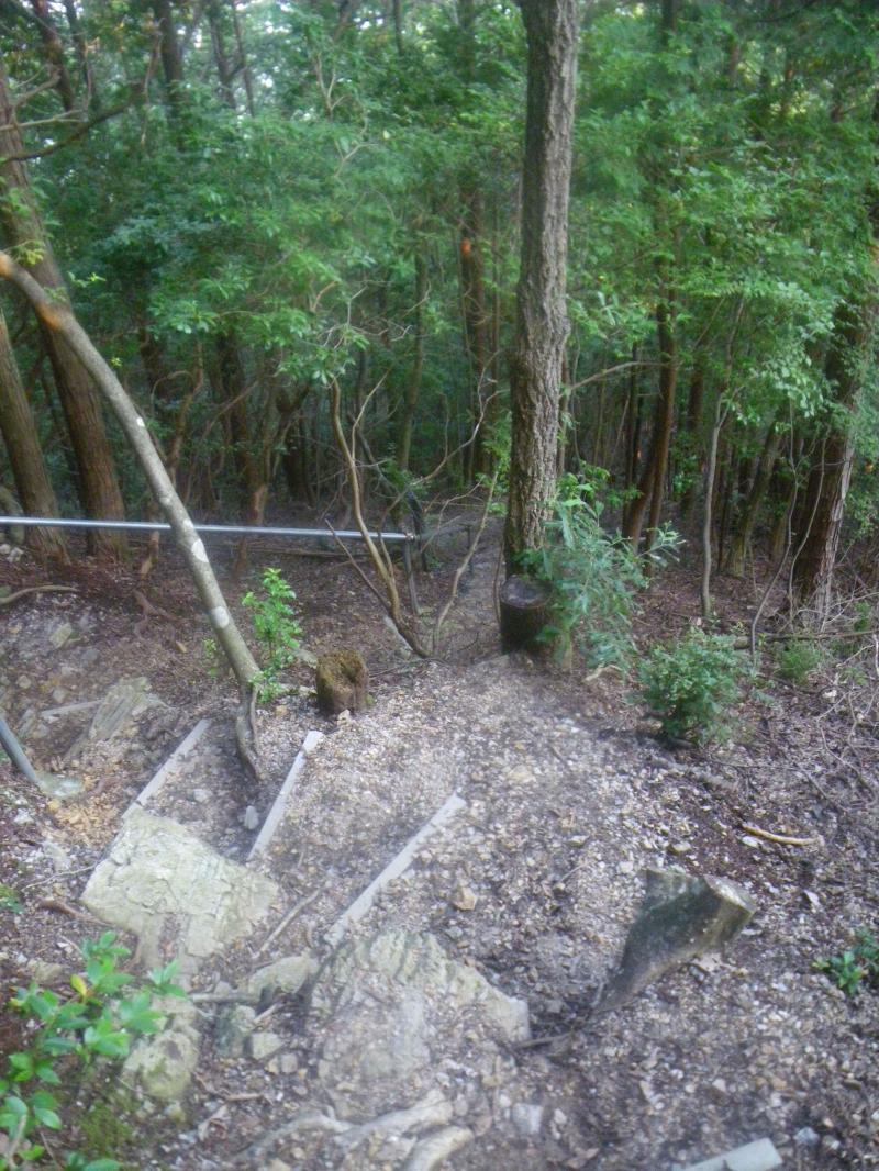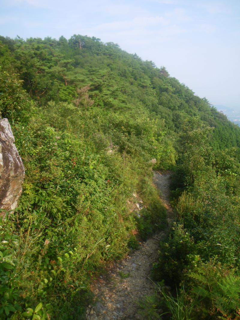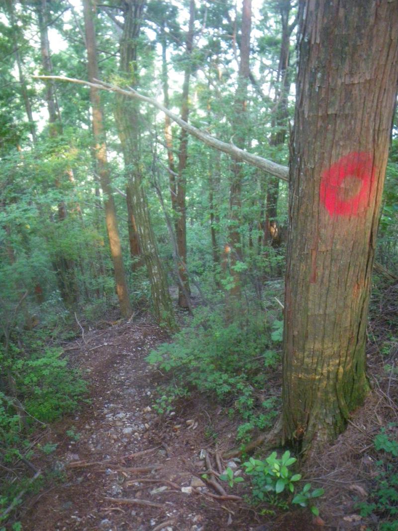 山頂からは中電の保守道で整備されてはいるが、これまた急坂。吸水してもしてもパワーがまったく上がらないが、いつもとはかなりスローペースで何とか下っていく。それにしても長い下りで、下の林道に着いた頃にはホッとする。ここから登山口まで意外と近く、車が見えた時は思わず、助かったと口ずさみました。しかし、相方に言わせるといつもと違う動きをしていたとのことで、ポカリスエットで何とか回復しました。