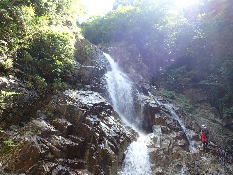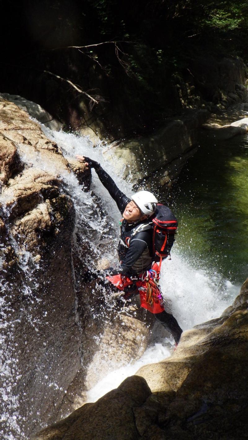 今回の見どころの一つであり核心部でもある大滝(15m)では、つじまいとアンディーの安全確保をいただきながら登攀。恐怖心を抱きながらも、マイナスイオンを感じて登る滝は楽しさが勝ります。