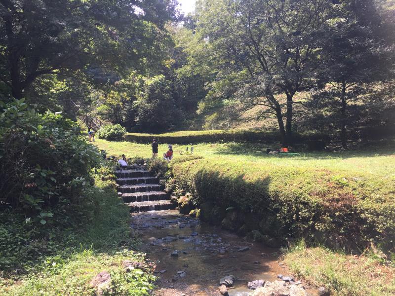 ダム上流部の渓流広場は水遊びができます。この日も10人程度が遊んでいました。