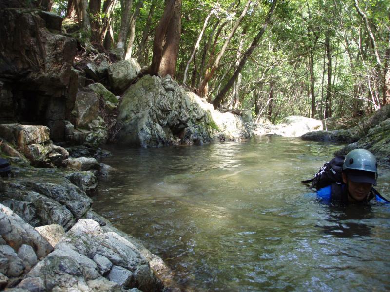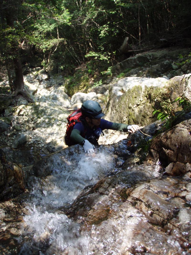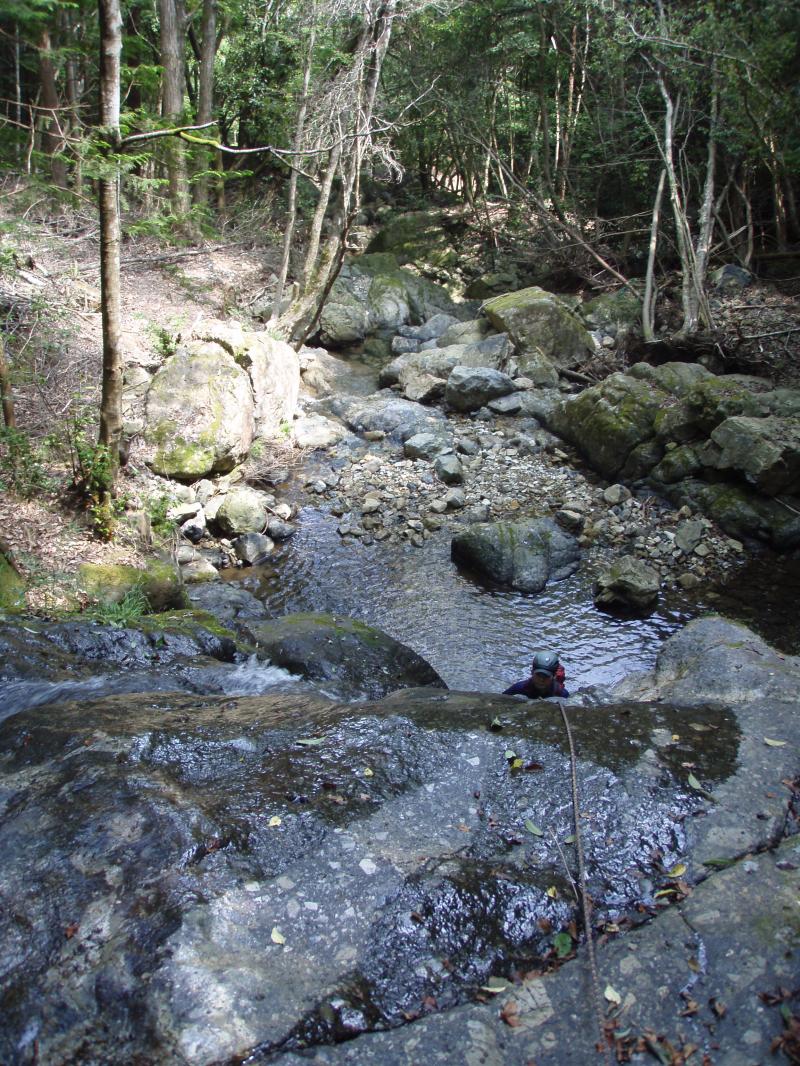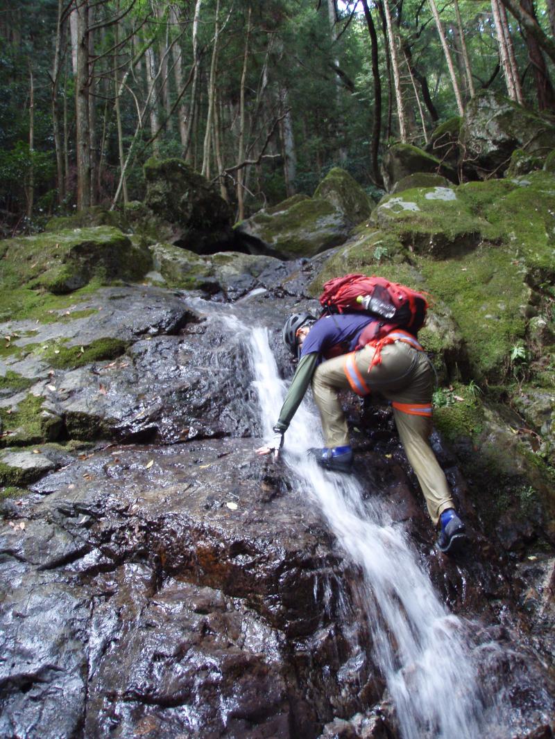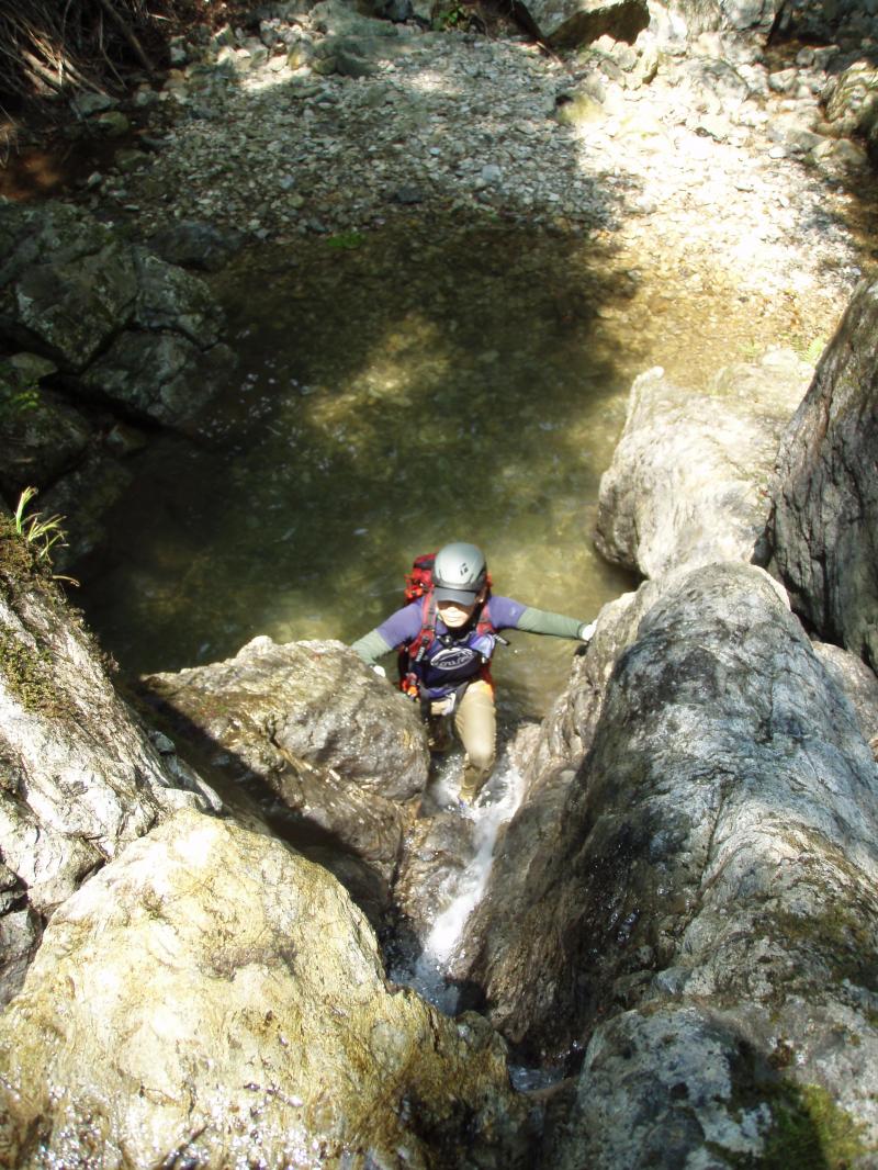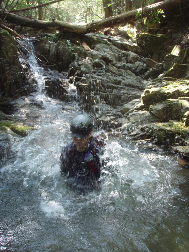 今回は沢登り初心者のアルバイト君を連れ、沢登りの基礎技術訓練を行いつつ遡行しました。基本的なホールドの掴み方、三点支持による移動、腰を落としたクライムダウンなどの移動技術、ロープの結び方、束ね方、セルフビレイ(自己確保)、そして…懸垂下降の猛特訓を施しましたが、汚れても水に飛び込むとすぐにキレイになるので、結構楽しみながらやってくれました。