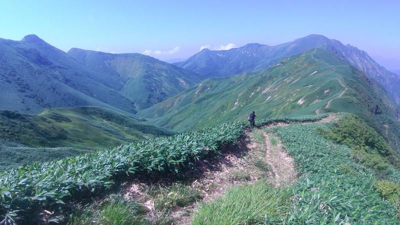 猛烈な日差しを受ける稜線を歩き、毛渡乗越から渡渉点へ向けて下降します。ここの道は迷いやすく注意が必要との記録が多かったですが、確かに上部は踏み跡が不明瞭で非常に分かりにくかったです。下降すると共に明瞭になっていきましたので、下り初めは慎重にルートファインディングした方が良いです。