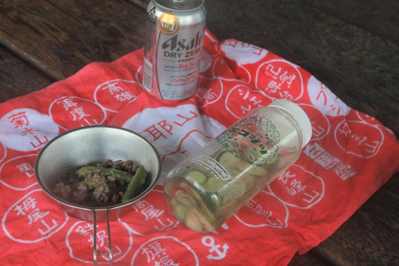 朝山母様より(山に一緒に行っている母のような方)先日の剣山のある徳島名物「スダチ」が届いたので、「鯵の三杯酢スダチ」と「アスパラとひき肉炒め(スダチ入り)」「スダチサイダー」作っているとお昼を過ぎてしまいましたが出発です。