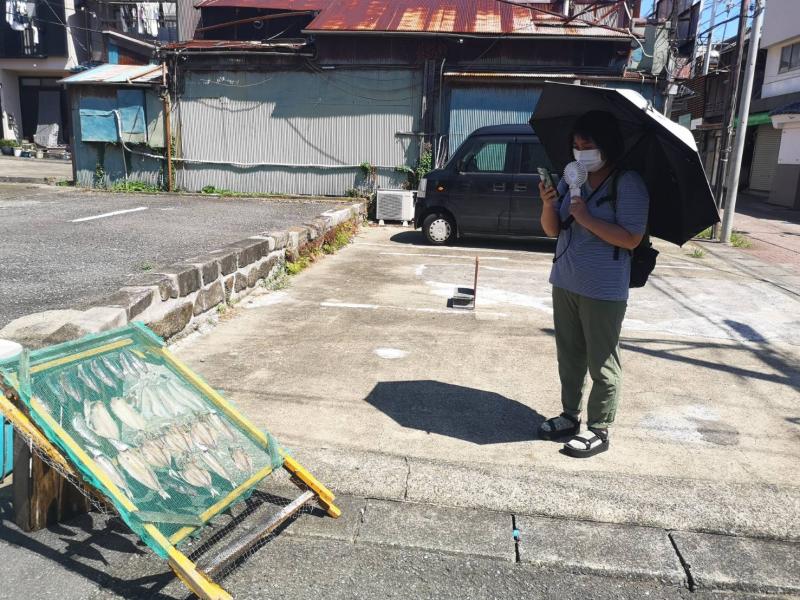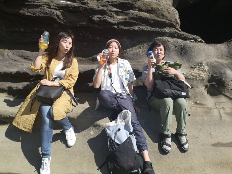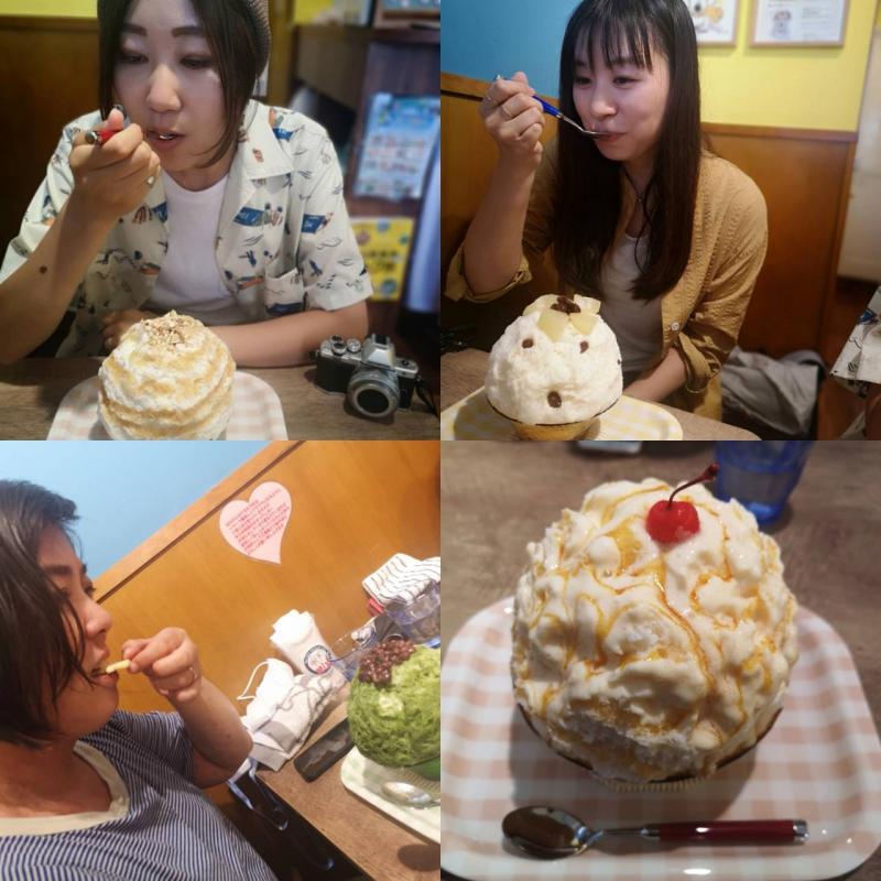 下り立った浜はまさに別天地、風化した岩とどこまでも広がる大海原に皆感動しまくり、思う存分写真を撮りました。波に素足を晒してみたり、岩の上を歩いてみたり、フナムシの大群にぞっとしてみたり...。ここでも随分とゆっくり過ごしました。おかげで汗だく、喉はカラカラになってしまったので、涼を求めて今度はかき氷屋さんへ。