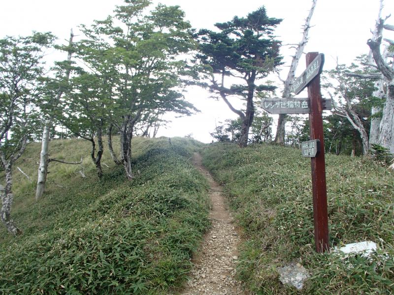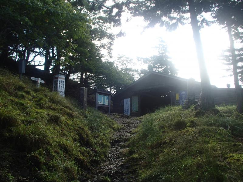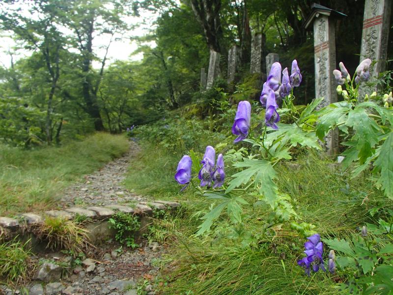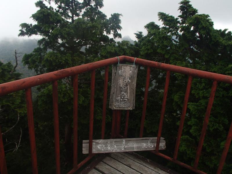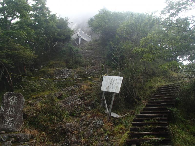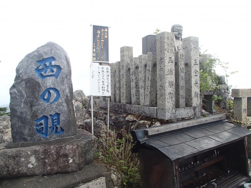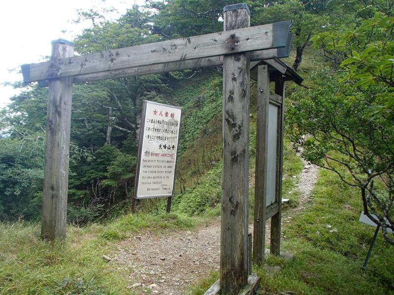 ・女人結界をくぐり山上辻へ。結構疲労がたまってきた。天気も悪いし、稲村ヶ岳はパスして下山しようかと思ったが、気合を入れ直して当初の予定通り、稲村ヶ岳へ。意外と登りもきつくなく、20分くらいで山頂に立つ。が、想像通り展望はガスの中・・・。