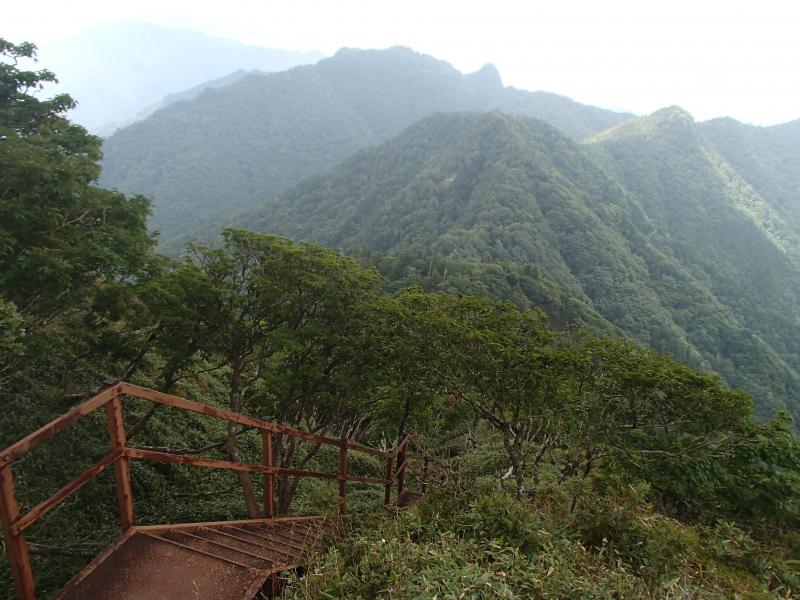 ・晴天下の山上ヶ岳に戻り、再度稲村ヶ岳へ向かう。鉄の階段を下って行くと、またもや雲行きが怪しくなり、レンゲ辻ではガスの中・・・。山の天気は本当に変わりやすい。9月なのに結構冷える。
