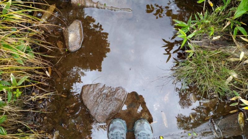 端や石の上から滑って派手にこけるのが怖ければ、堂々とぬかるみを歩いて下さい。GORE-TEXの靴ならある程度の深さまでハマっても大丈夫!