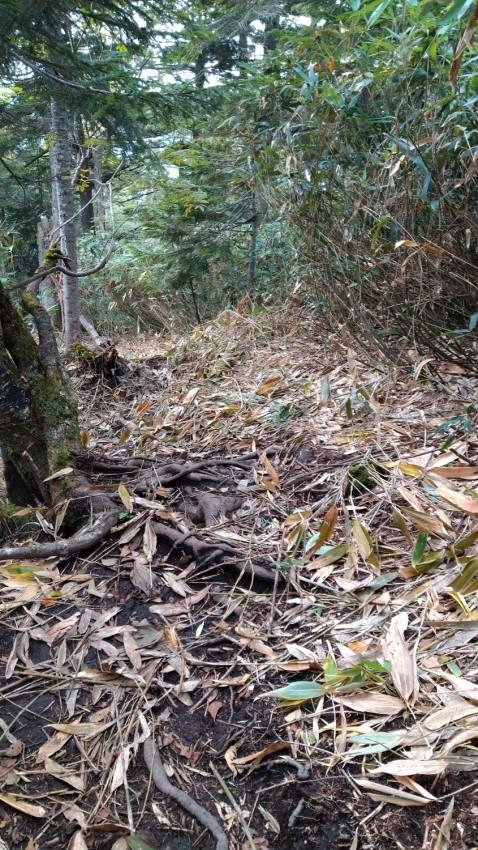 ぬかるみ×急斜面、さらに刈り取られた笹の茎が加わってとても歩きにくかったです。