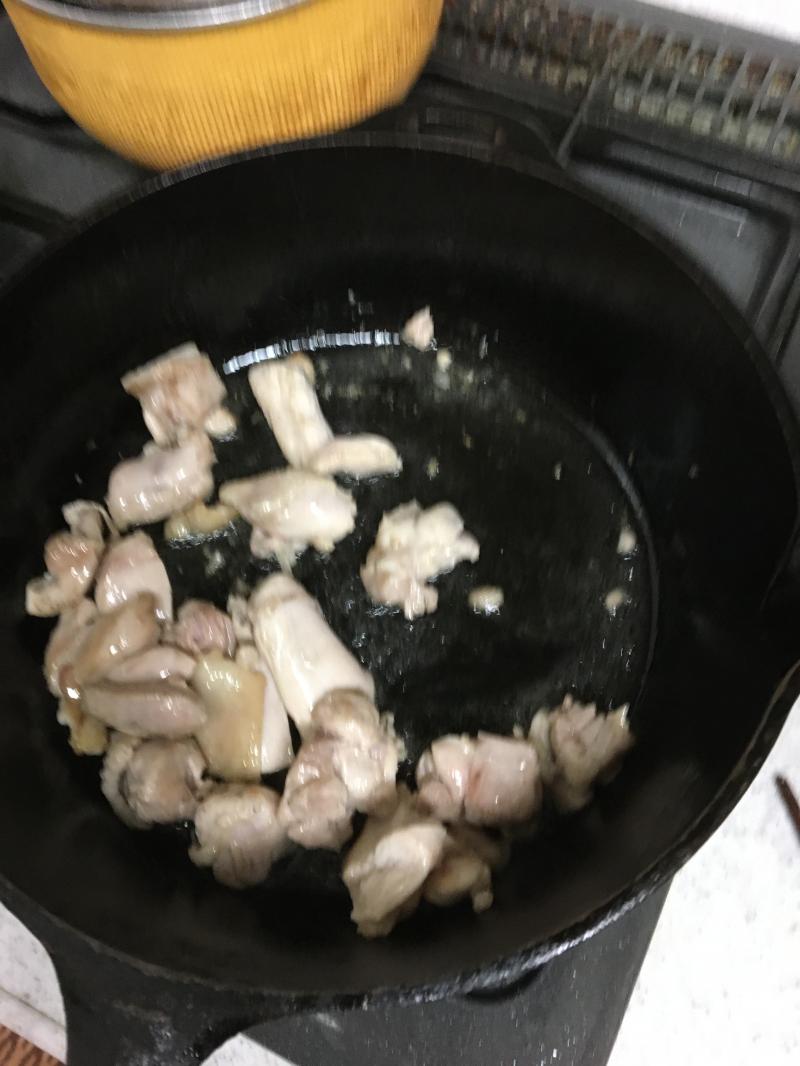 ②よく熱したダッチオーブンに油をいれて中火で鶏肉を炒めます。