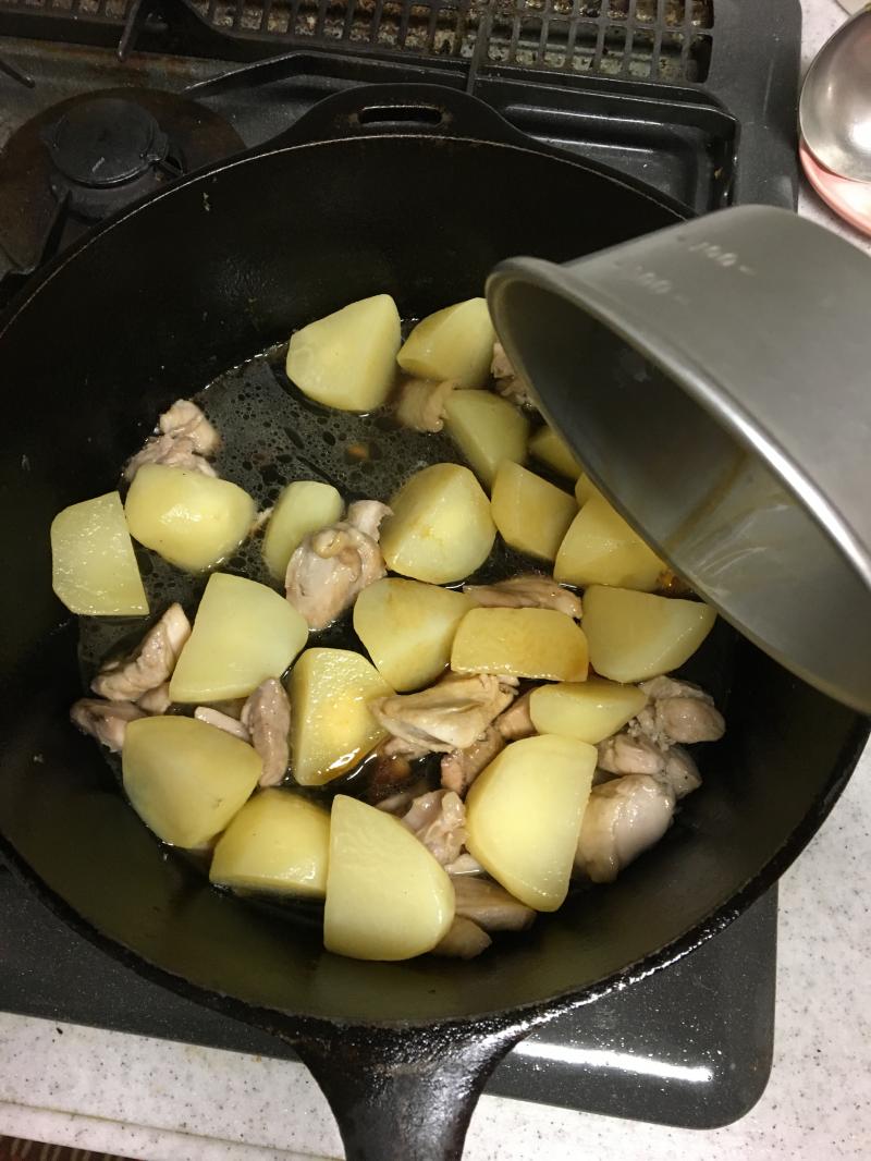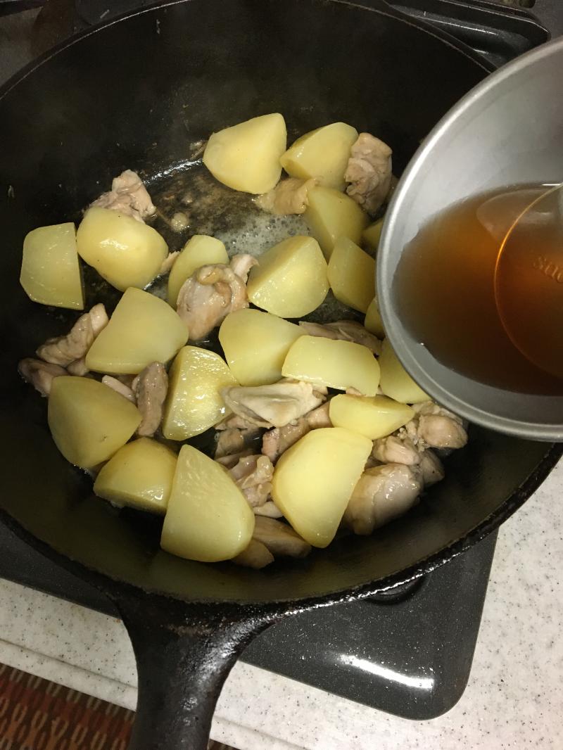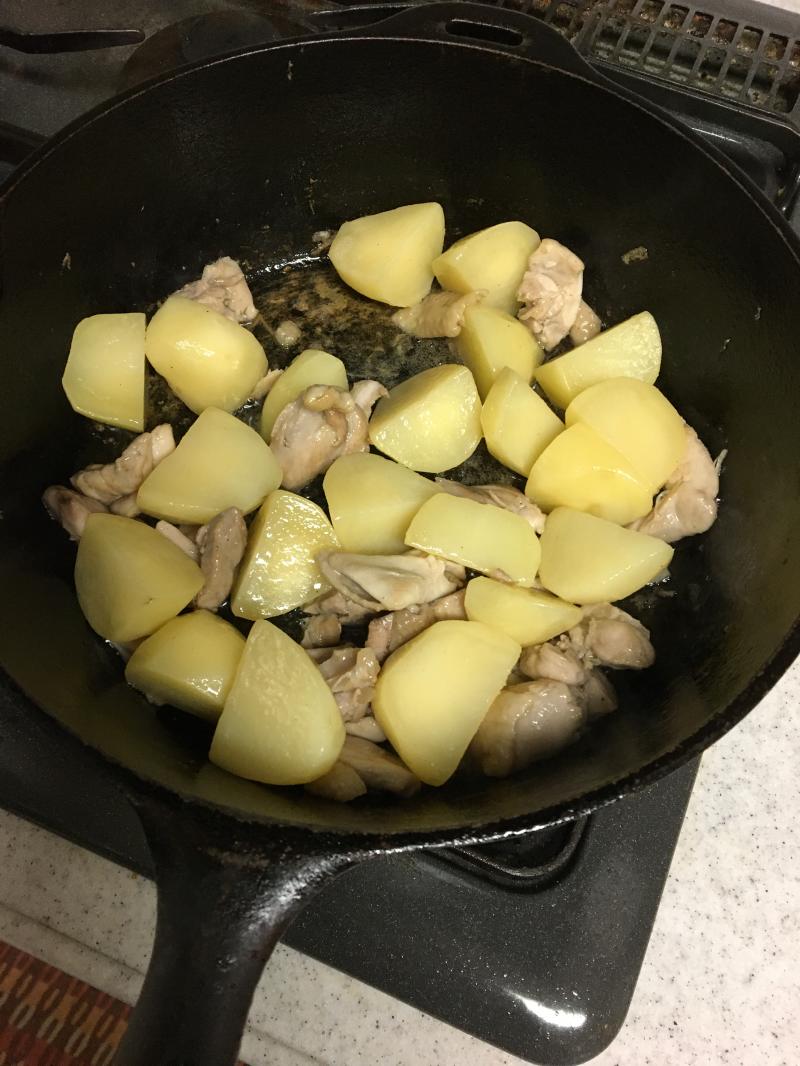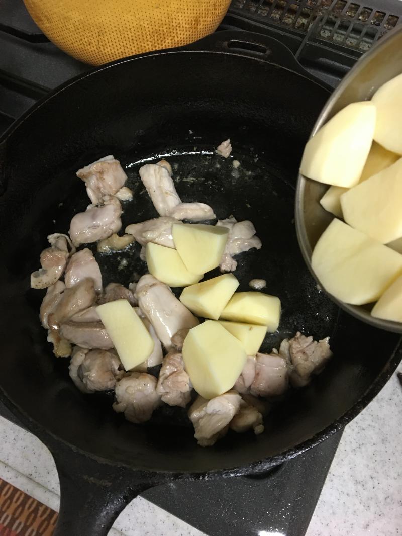 ③鶏肉に火が通ってきたらじゃがいもを入れて端が透き通ってくるまで炒めます。