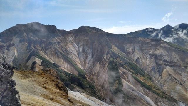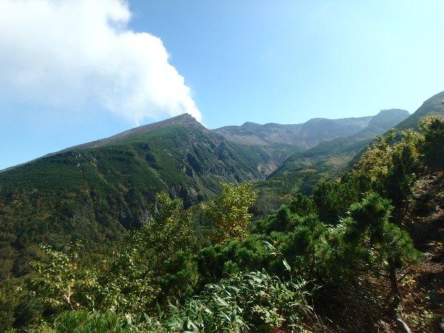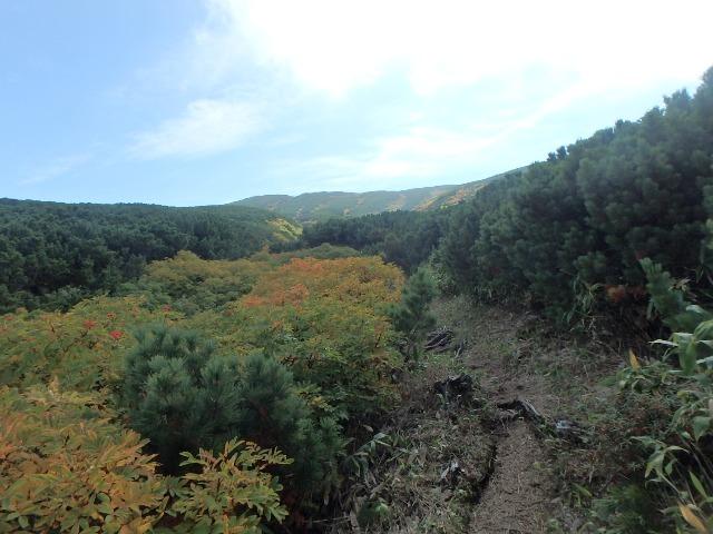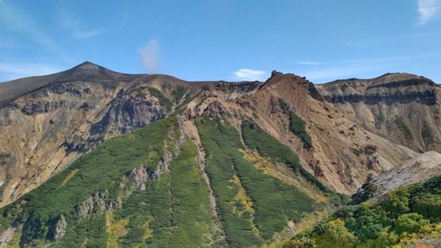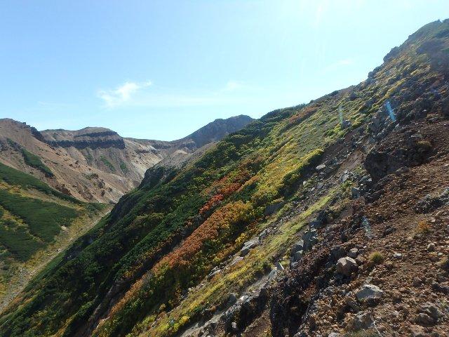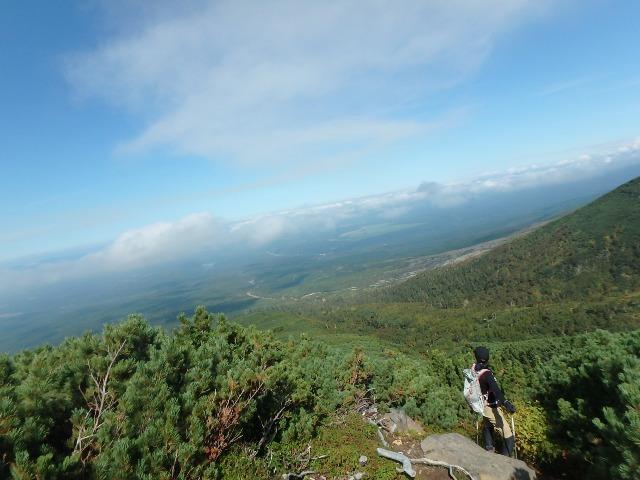 妻も一緒だったのでのんびりと9時ころに歩き始め、紅葉はちょうど色付きがよくなってきた頃で十分楽しめました。風もなく穏やかで涼しく歩きやすく、2時間ほどで頂上につくと目の前に十勝岳やカミホロの絶景。少しガスが出てきましたが、気持ちの良い頂上での一時を楽しめました。